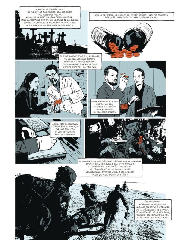Cette nouvelle bande dessinée de 136 pages, présente en détails les nombreux conflits liés à la drogue et énumère les innombrables variétés de pilules, graines, feuilles, tablettes et poudres qui composent cet ensemble de dangereuses matières semant la désolation, des troubles divers et la mort un peu partout sur la planète.