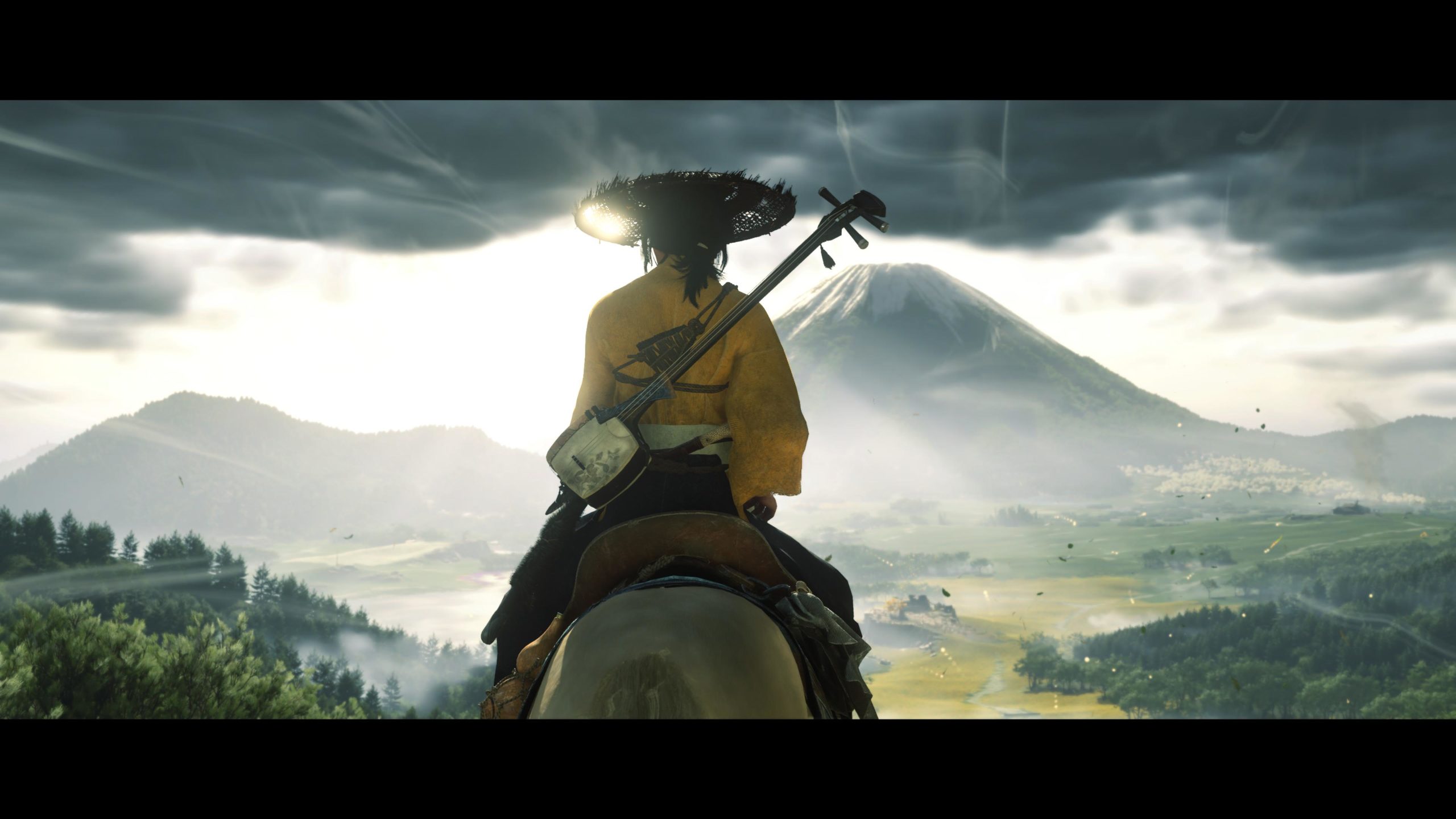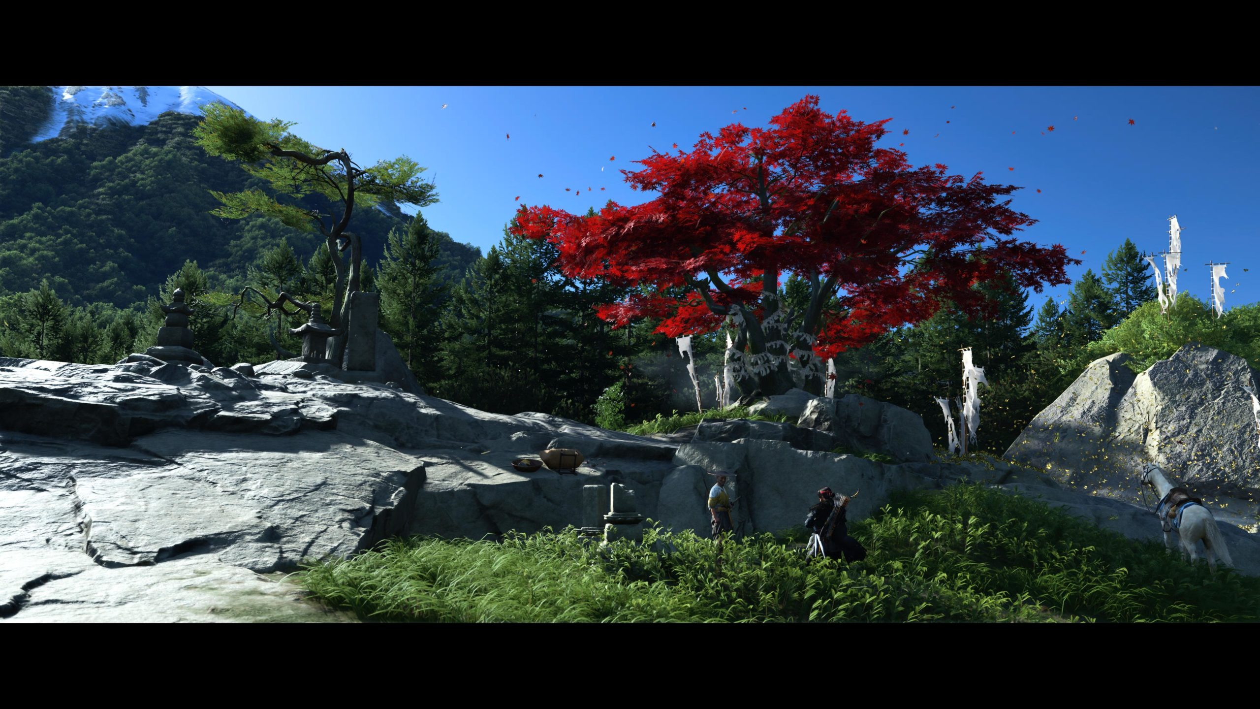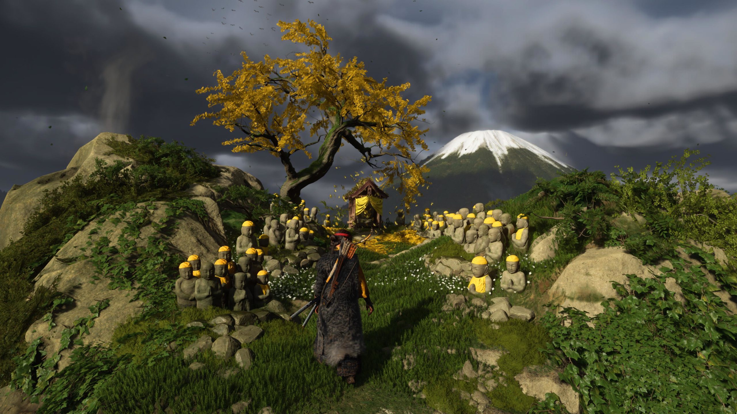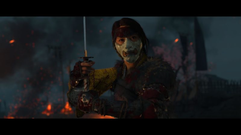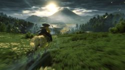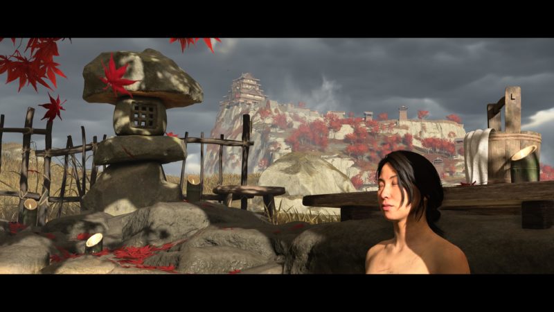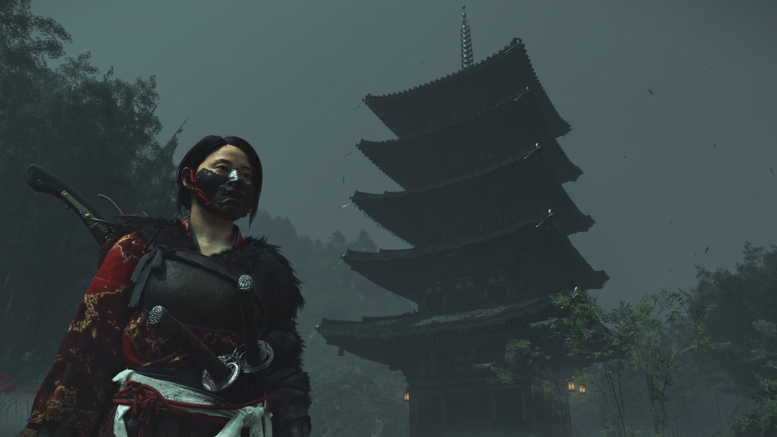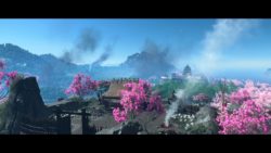 Artistiquement et techniquement, Ghost of Yōtei est magnifique. Que se doit la modélisation des personnages, très détaillé pour les principaux, un peu moins pour les secondaires et encore moins pour les tertiaires, ou les environnements qui sont tout bonnement grandioses et varié font du titre un très, très joli jeu. C’est aussi le festival de particules. Les feuilles, les pétales de fleurs, les flames ou la neige le jeu reste dans un éternel mouvement apaisant et berçant. L’herbe et les arbres dansent au rythme du vent avec grâce. Un gros travail sur les animations est aussi à relever. Atsu sort ses sabres avec justesse. La chorégraphie dans les combats est encore une fois sublimée par le travail des artistes. Le souci du détail est à l’œuvre. L’atmosphère du jeu est toujours aussi réussie avec le changement climatique dynamique. Les nuages volumétriques couvrent le mont Yōtei de la meilleure des manières. La gestion de la lumière est soignée. C’est magnifique. On regrettera un peu le manque d’interaction avec le décor. On peut faire de jolies balafres dans les hautes herbes et casser certains objets de temps à autre, mais beaucoup d’assets restes inertes à nos actions.