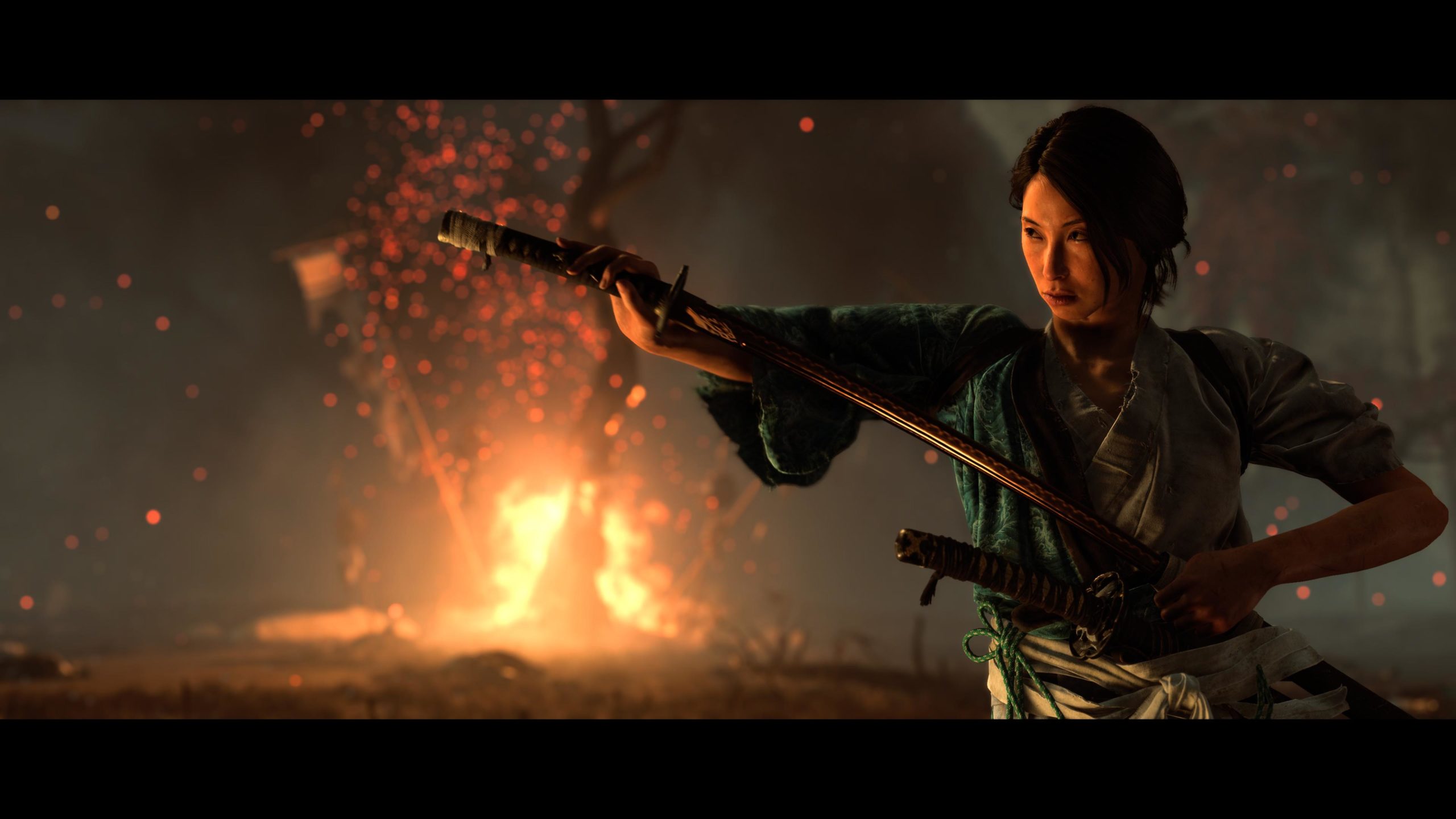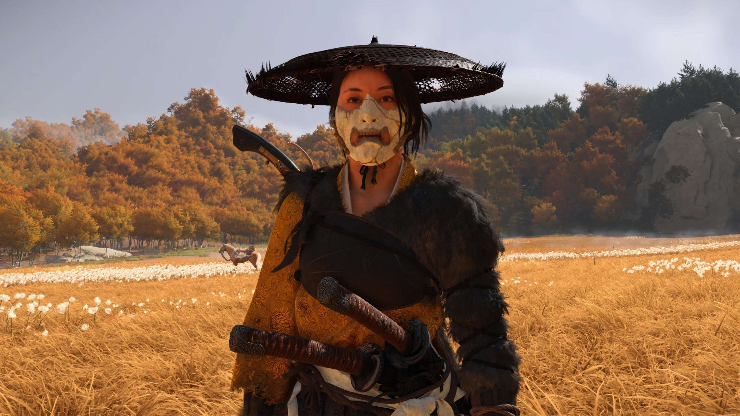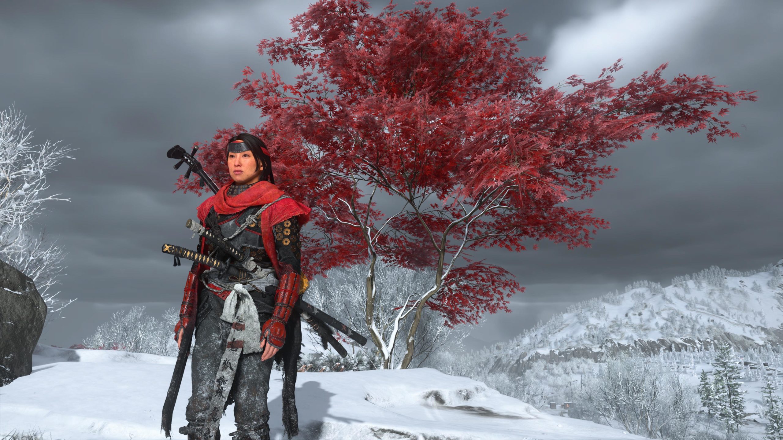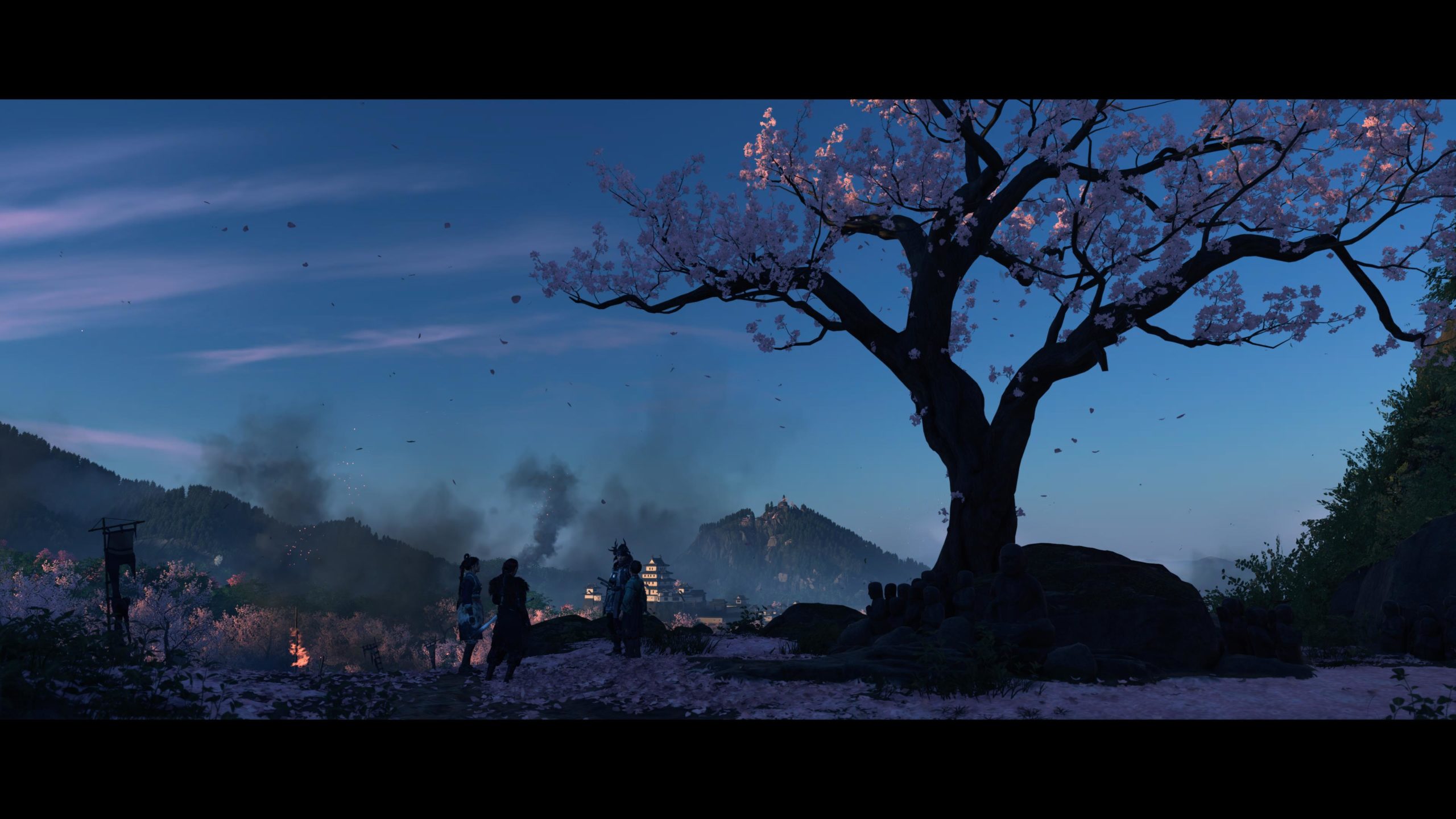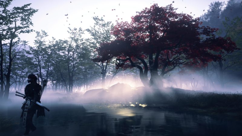 Artistiquement et techniquement, Ghost of Yōtei est magnifique. Que se doit la modélisation des personnages, très détaillé pour les principaux, un peu moins pour les secondaires et encore moins pour les tertiaires, ou les environnements qui sont tout bonnement grandioses et varié font du titre un très, très joli jeu. C’est aussi le festival de particules. Les feuilles, les pétales de fleurs, les flames ou la neige le jeu reste dans un éternel mouvement apaisant et berçant. L’herbe et les arbres dansent au rythme du vent avec grâce. Un gros travail sur les animations est aussi à relever. Atsu sort ses sabres avec justesse. La chorégraphie dans les combats est encore une fois sublimée par le travail des artistes. Le souci du détail est à l’œuvre. L’atmosphère du jeu est toujours aussi réussie avec le changement climatique dynamique. Les nuages volumétriques couvrent le mont Yōtei de la meilleure des manières. La gestion de la lumière est soignée. C’est magnifique. On regrettera un peu le manque d’interaction avec le décor. On peut faire de jolies balafres dans les hautes herbes et casser certains objets de temps à autre, mais beaucoup d’assets restes inertes à nos actions.