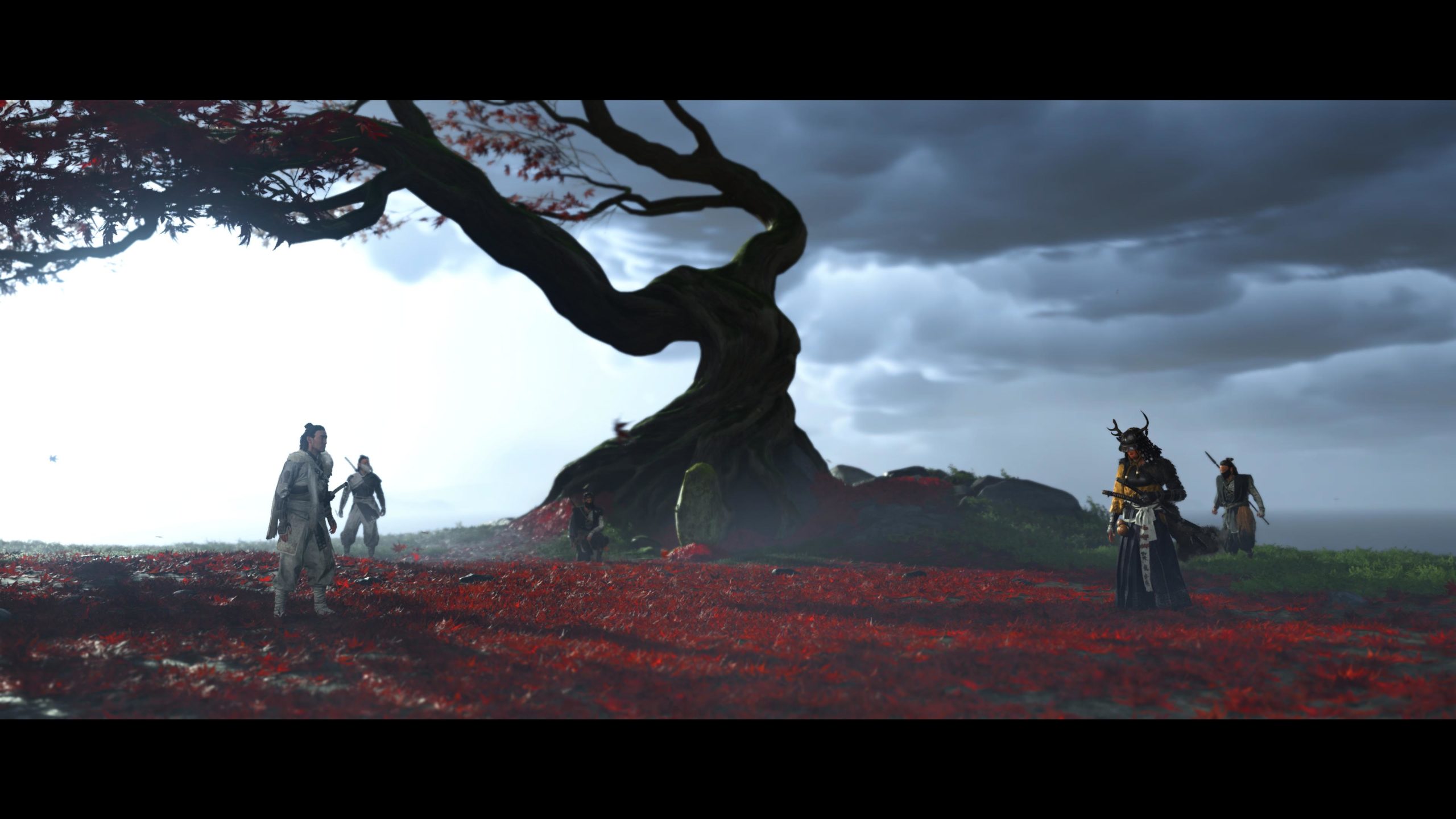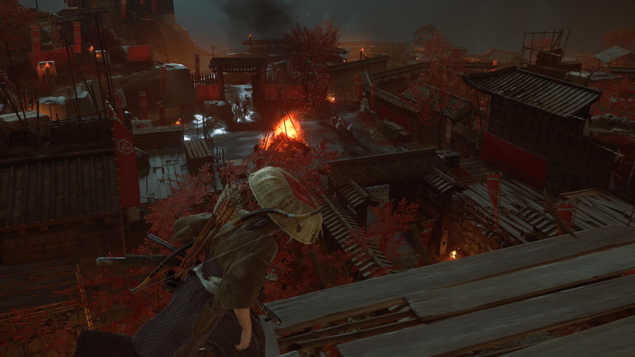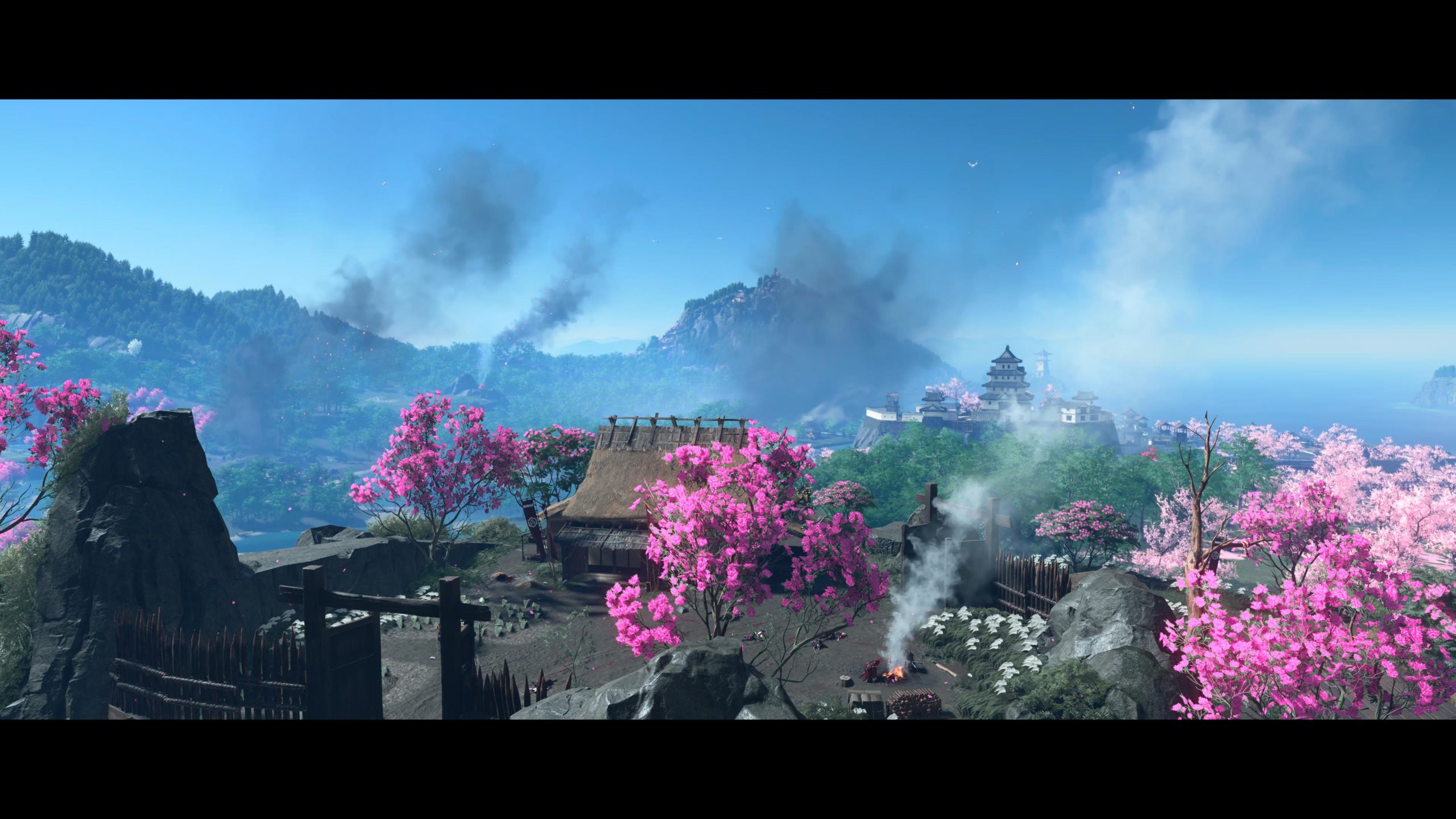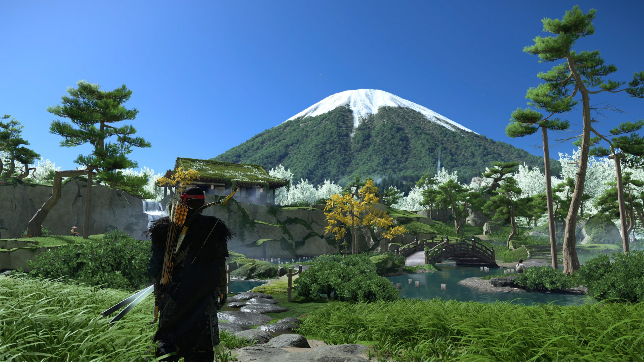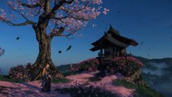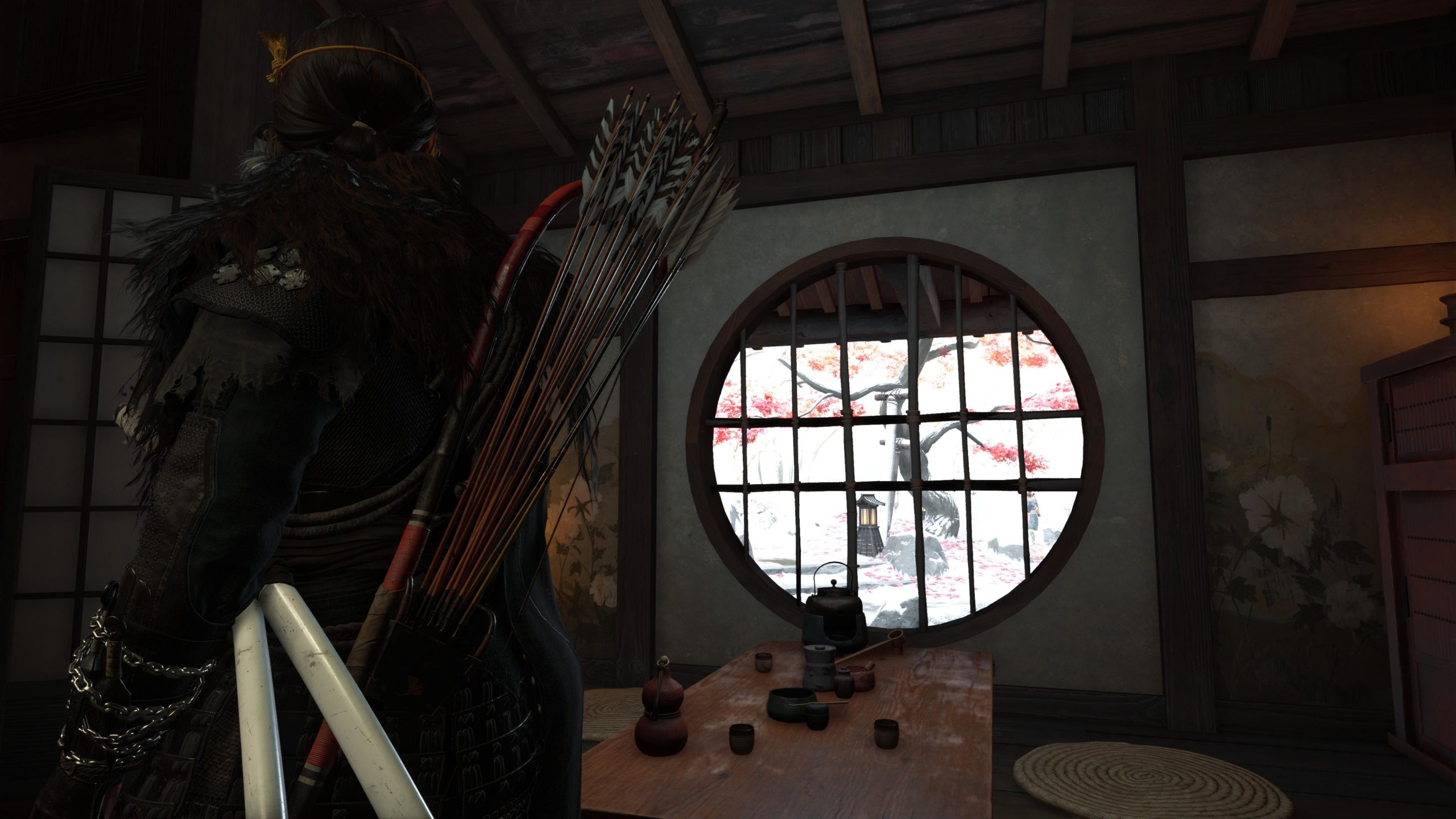 Artistiquement et techniquement, Ghost of Yōtei est magnifique. Que se doit la modélisation des personnages, très détaillé pour les principaux, un peu moins pour les secondaires et encore moins pour les tertiaires, ou les environnements qui sont tout bonnement grandioses et varié font du titre un très, très joli jeu. C’est aussi le festival de particules. Les feuilles, les pétales de fleurs, les flames ou la neige le jeu reste dans un éternel mouvement apaisant et berçant. L’herbe et les arbres dansent au rythme du vent avec grâce. Un gros travail sur les animations est aussi à relever. Atsu sort ses sabres avec justesse. La chorégraphie dans les combats est encore une fois sublimée par le travail des artistes. Le souci du détail est à l’œuvre. L’atmosphère du jeu est toujours aussi réussie avec le changement climatique dynamique. Les nuages volumétriques couvrent le mont Yōtei de la meilleure des manières. La gestion de la lumière est soignée. C’est magnifique. On regrettera un peu le manque d’interaction avec le décor. On peut faire de jolies balafres dans les hautes herbes et casser certains objets de temps à autre, mais beaucoup d’assets restes inertes à nos actions.