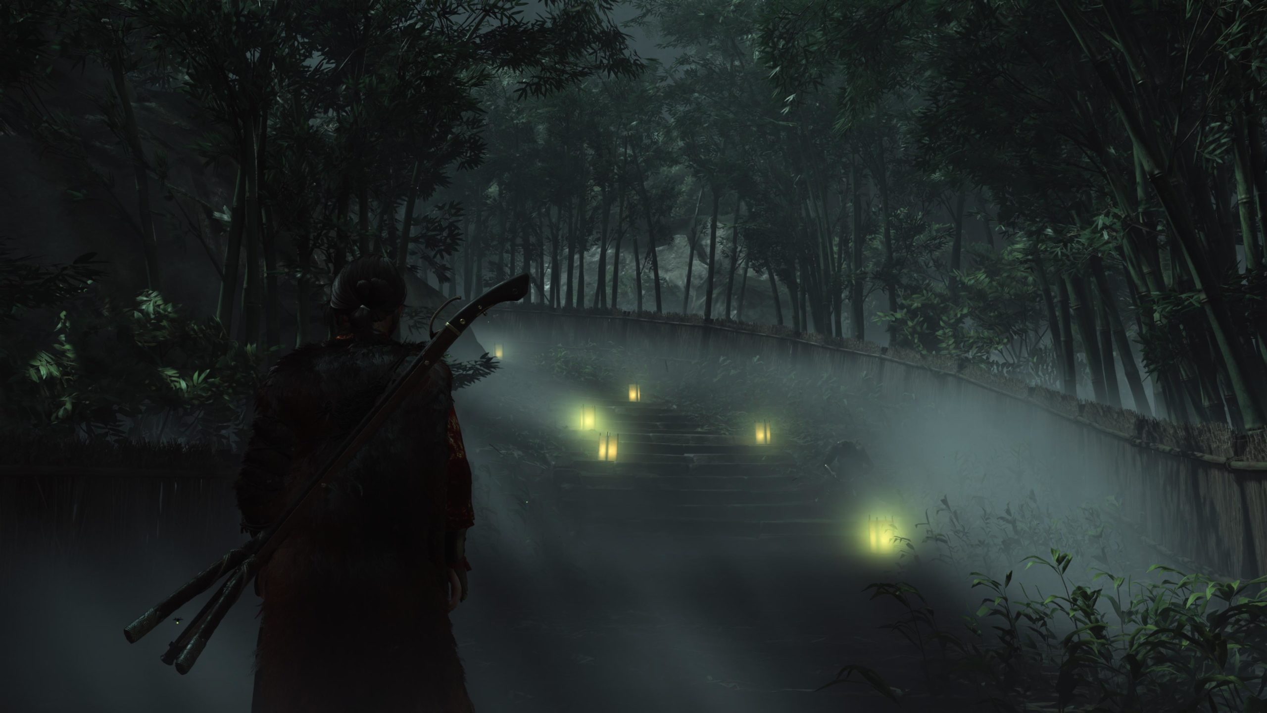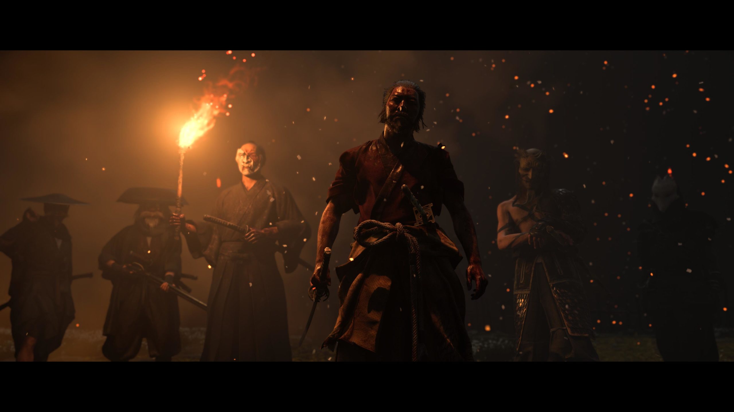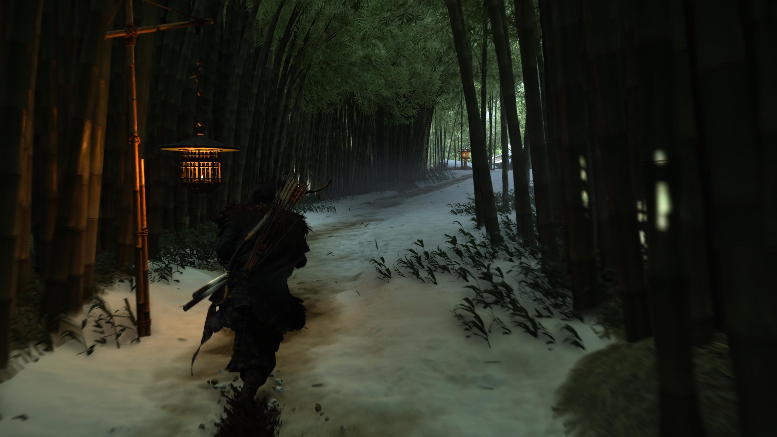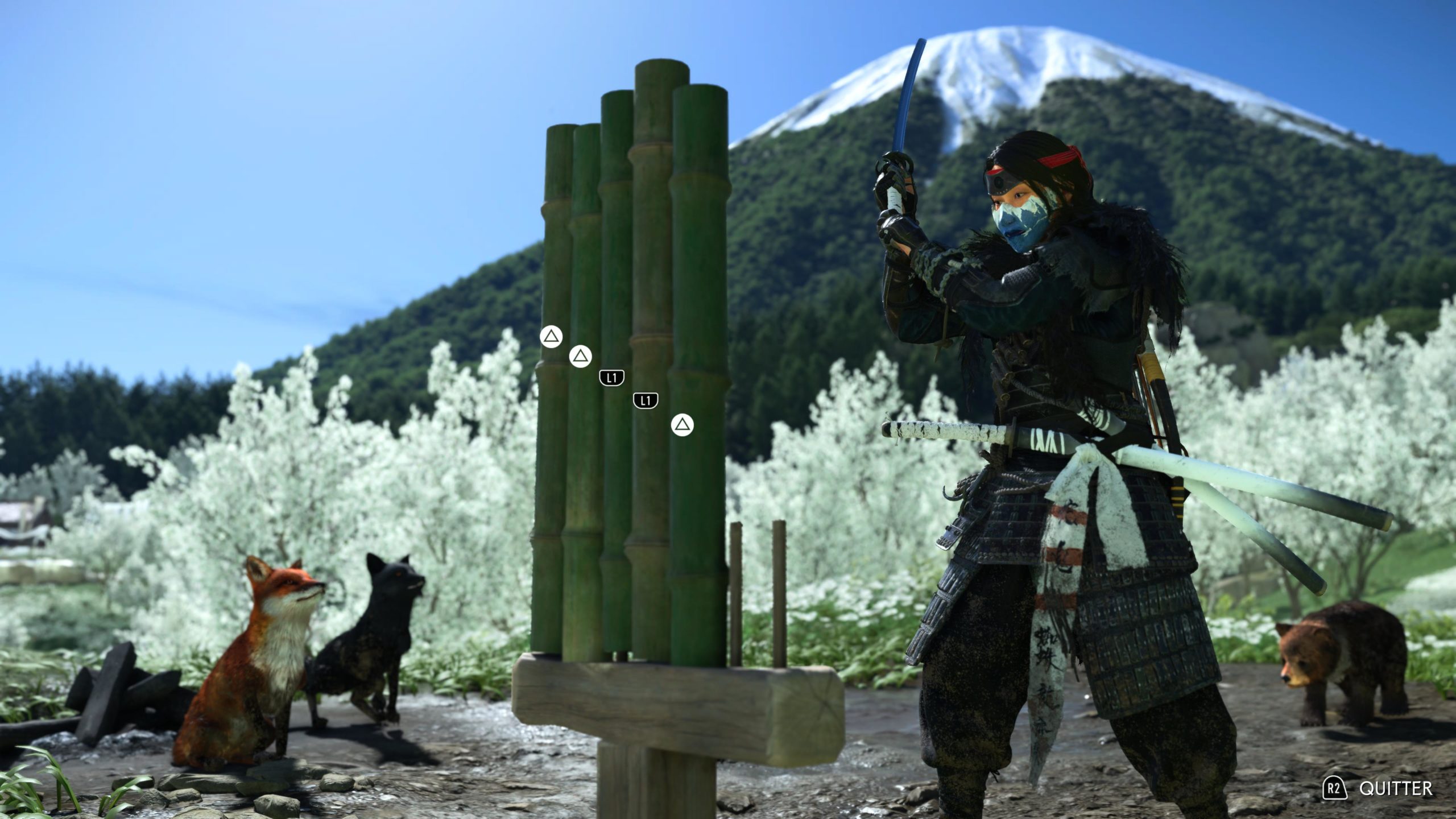 Artistiquement et techniquement, Ghost of Yōtei est magnifique. Que se doit la modélisation des personnages, très détaillé pour les principaux, un peu moins pour les secondaires et encore moins pour les tertiaires, ou les environnements qui sont tout bonnement grandioses et varié font du titre un très, très joli jeu. C’est aussi le festival de particules. Les feuilles, les pétales de fleurs, les flames ou la neige le jeu reste dans un éternel mouvement apaisant et berçant. L’herbe et les arbres dansent au rythme du vent avec grâce. Un gros travail sur les animations est aussi à relever. Atsu sort ses sabres avec justesse. La chorégraphie dans les combats est encore une fois sublimée par le travail des artistes. Le souci du détail est à l’œuvre. L’atmosphère du jeu est toujours aussi réussie avec le changement climatique dynamique. Les nuages volumétriques couvrent le mont Yōtei de la meilleure des manières. La gestion de la lumière est soignée. C’est magnifique. On regrettera un peu le manque d’interaction avec le décor. On peut faire de jolies balafres dans les hautes herbes et casser certains objets de temps à autre, mais beaucoup d’assets restes inertes à nos actions.