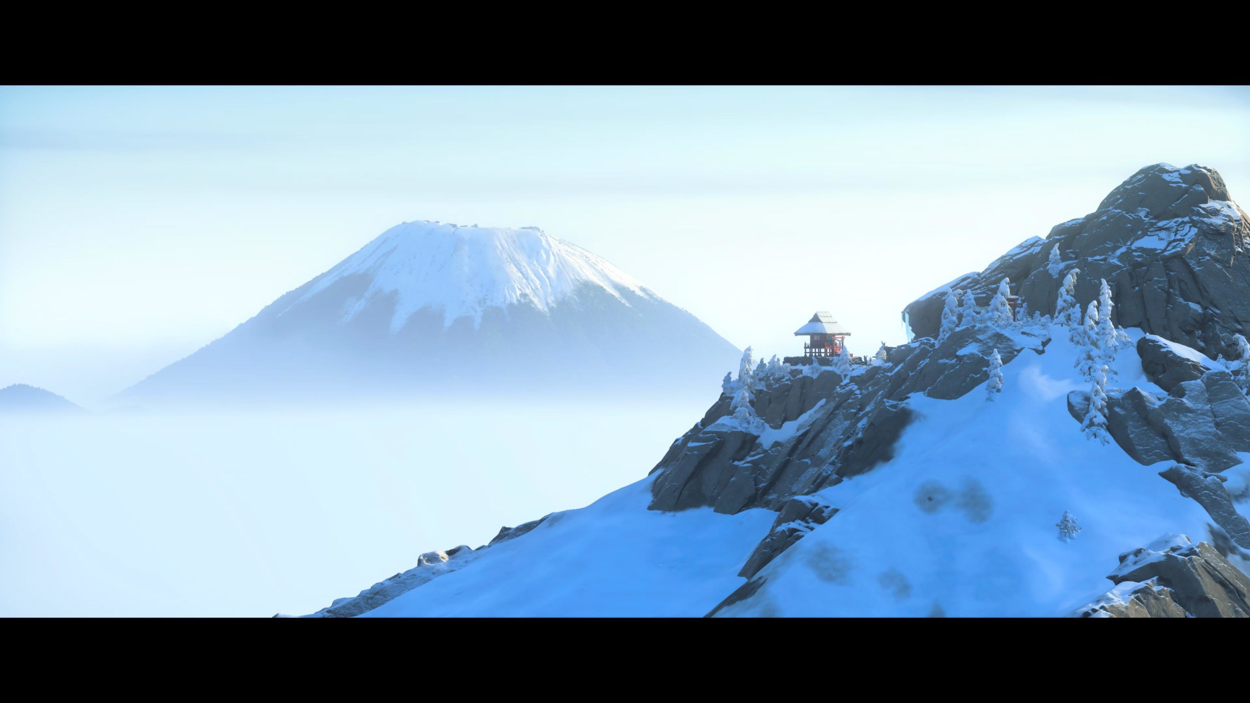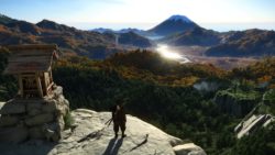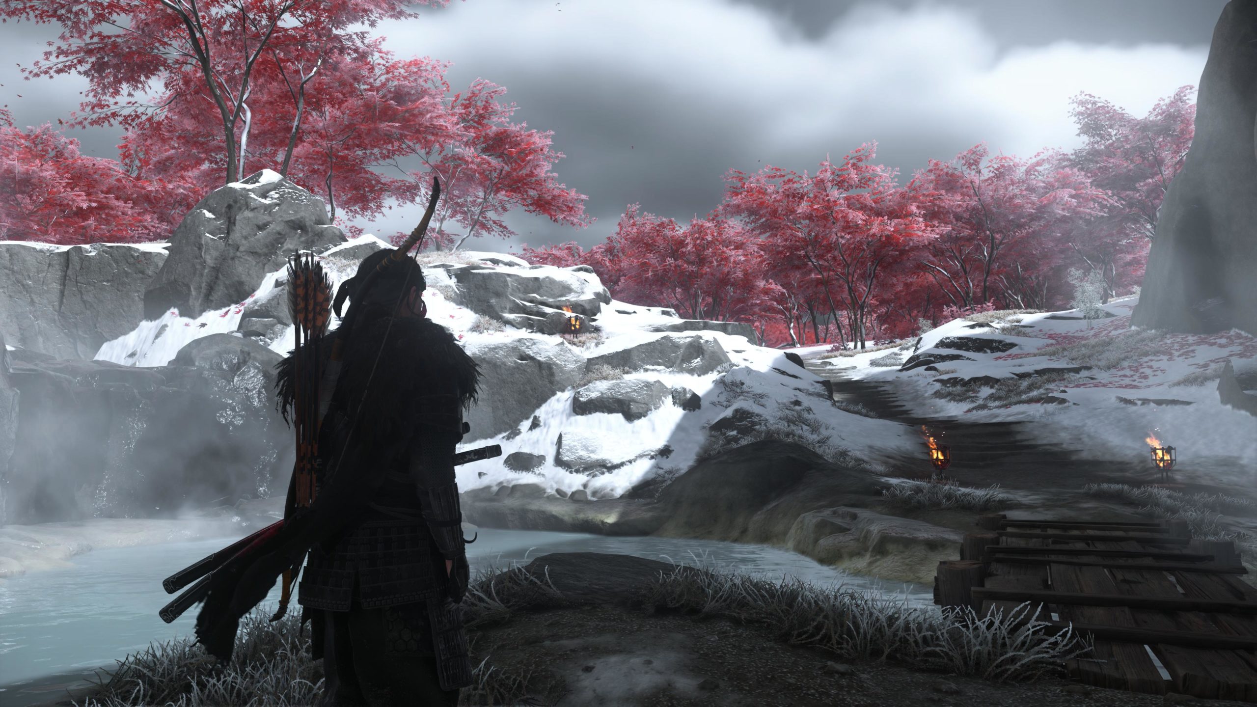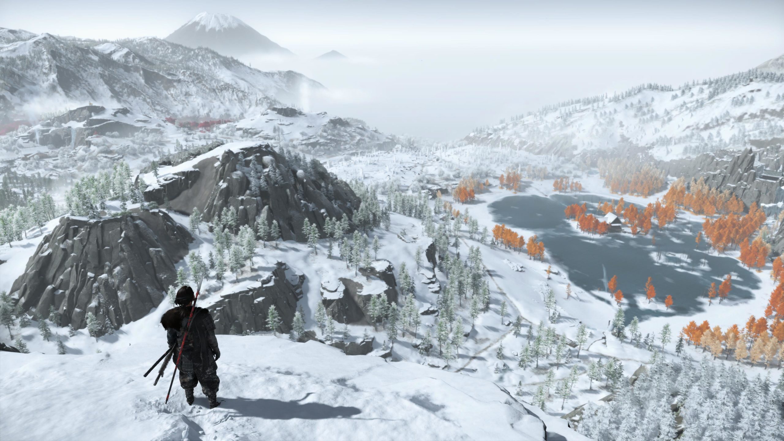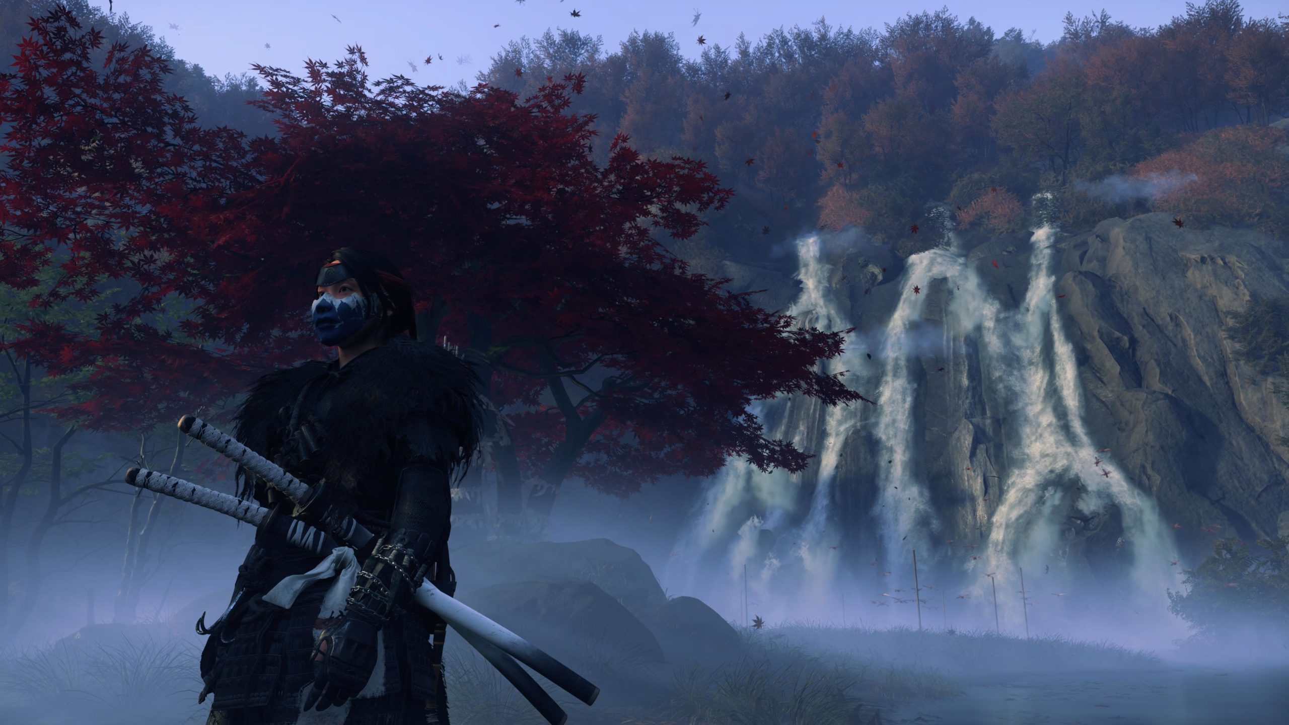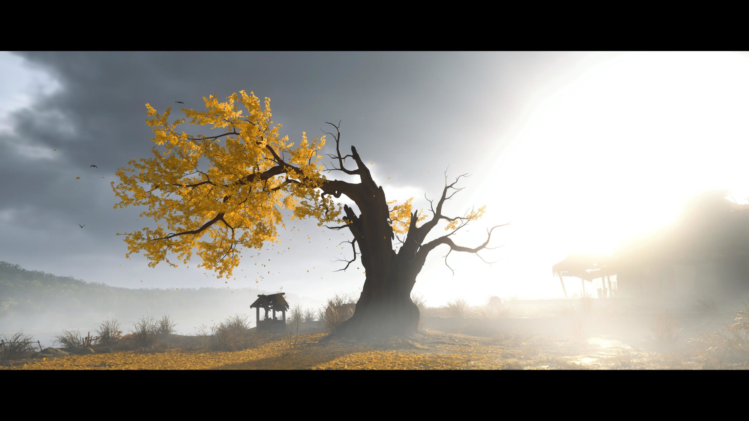Artistiquement et techniquement, Ghost of Yōtei est magnifique. Que se doit la modélisation des personnages, très détaillé pour les principaux, un peu moins pour les secondaires et encore moins pour les tertiaires, ou les environnements qui sont tout bonnement grandioses et varié font du titre un très, très joli jeu. C’est aussi le festival de particules. Les feuilles, les pétales de fleurs, les flames ou la neige le jeu reste dans un éternel mouvement apaisant et berçant. L’herbe et les arbres dansent au rythme du vent avec grâce. Un gros travail sur les animations est aussi à relever. Atsu sort ses sabres avec justesse. La chorégraphie dans les combats est encore une fois sublimée par le travail des artistes. Le souci du détail est à l’œuvre. L’atmosphère du jeu est toujours aussi réussie avec le changement climatique dynamique. Les nuages volumétriques couvrent le mont Yōtei de la meilleure des manières. La gestion de la lumière est soignée. C’est magnifique. On regrettera un peu le manque d’interaction avec le décor. On peut faire de jolies balafres dans les hautes herbes et casser certains objets de temps à autre, mais beaucoup d’assets restes inertes à nos actions.