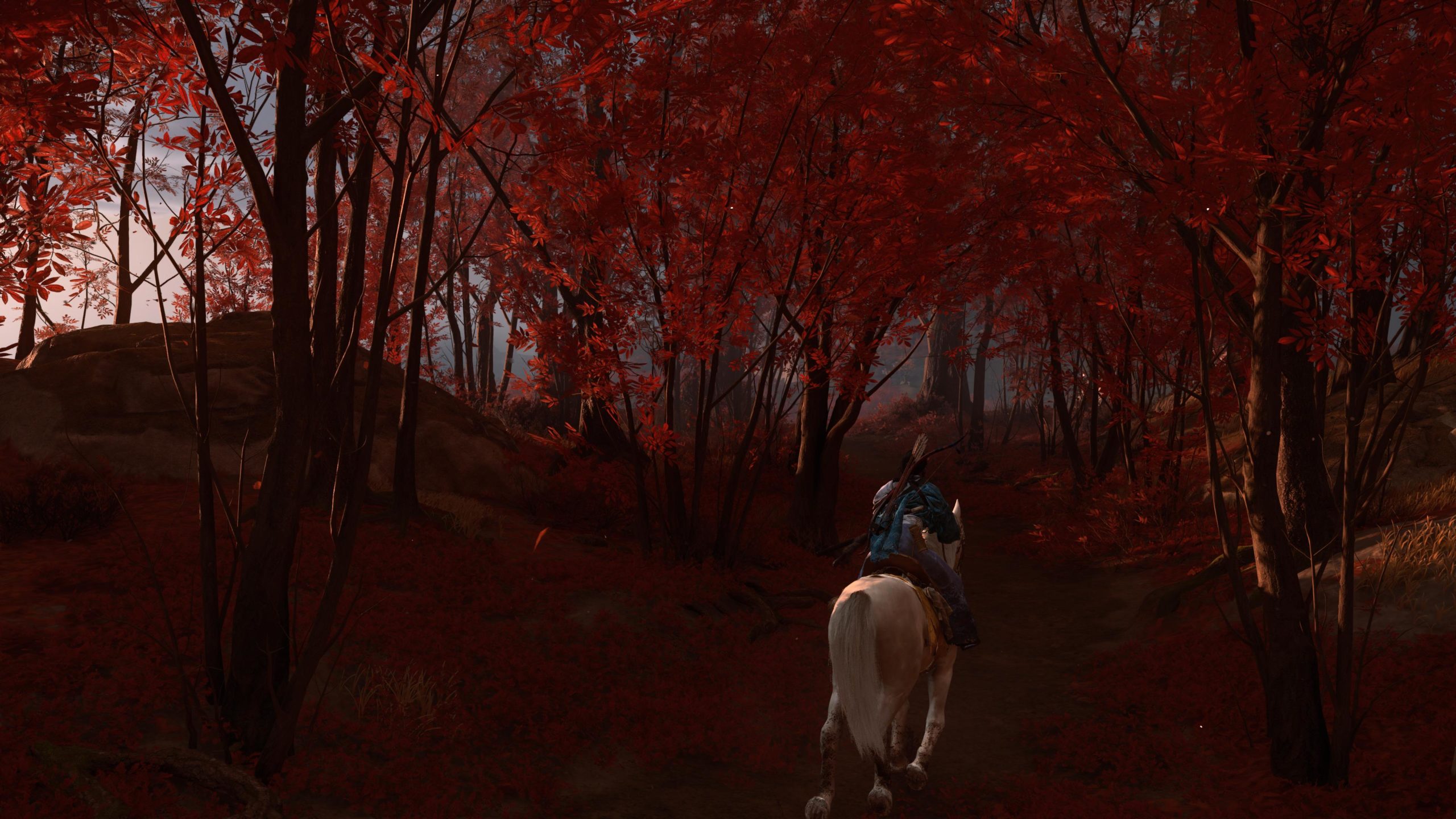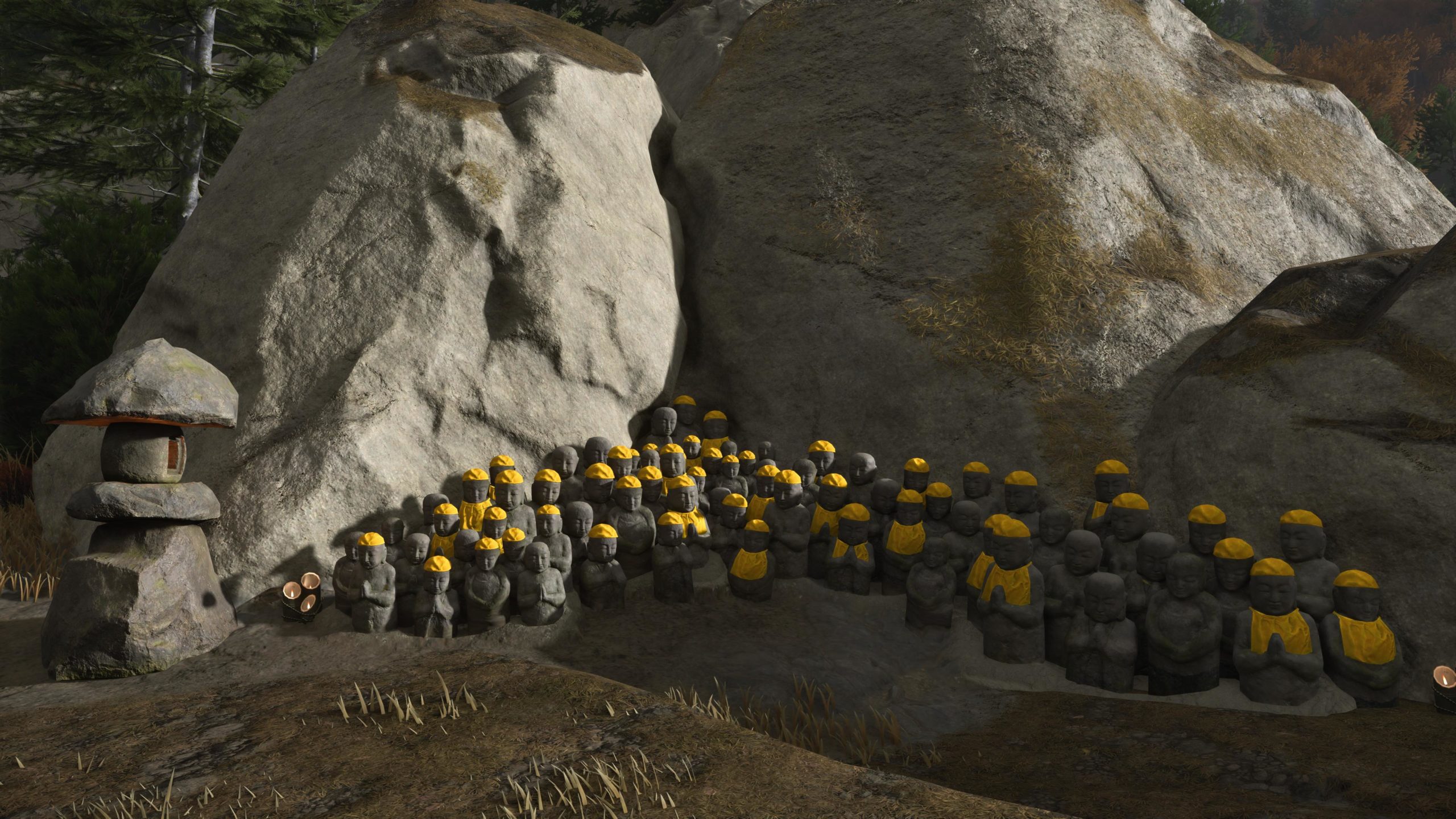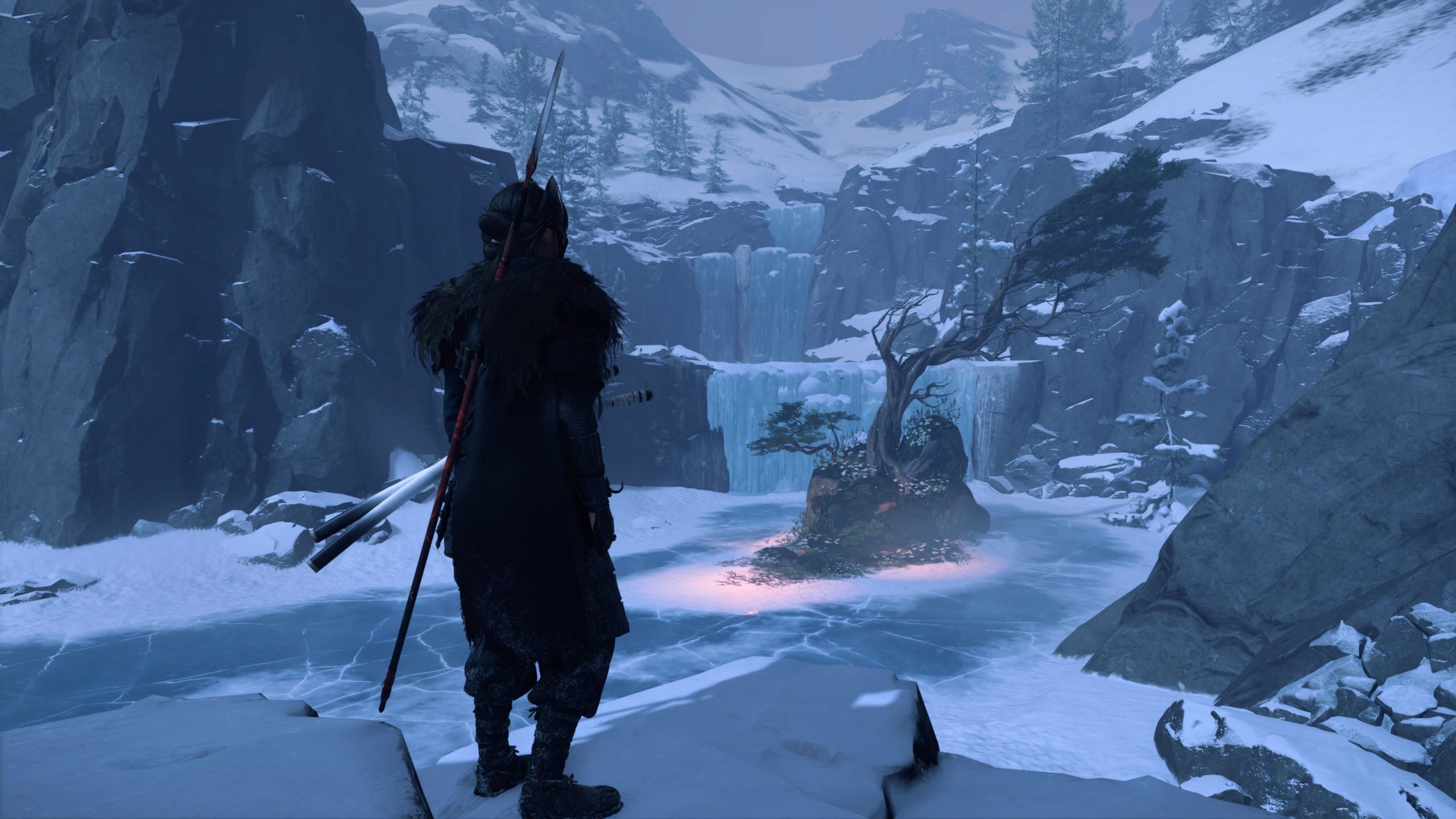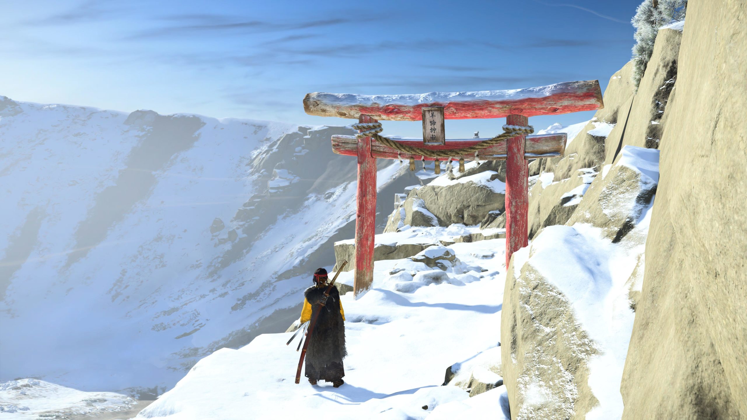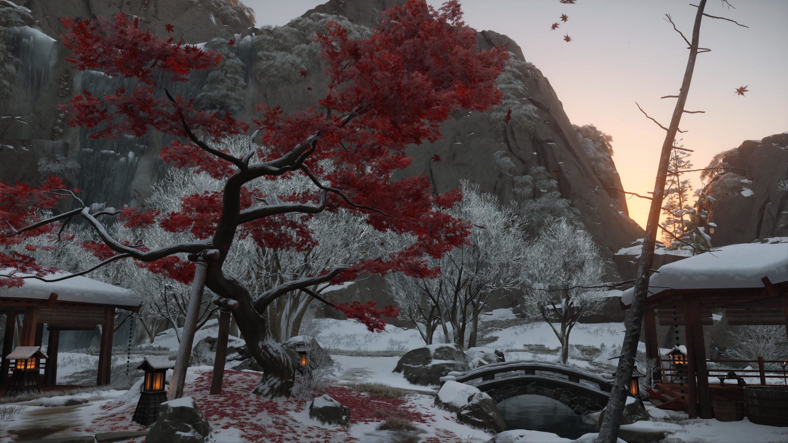 Artistiquement et techniquement, Ghost of Yōtei est magnifique. Que se doit la modélisation des personnages, très détaillé pour les principaux, un peu moins pour les secondaires et encore moins pour les tertiaires, ou les environnements qui sont tout bonnement grandioses et varié font du titre un très, très joli jeu. C’est aussi le festival de particules. Les feuilles, les pétales de fleurs, les flames ou la neige le jeu reste dans un éternel mouvement apaisant et berçant. L’herbe et les arbres dansent au rythme du vent avec grâce. Un gros travail sur les animations est aussi à relever. Atsu sort ses sabres avec justesse. La chorégraphie dans les combats est encore une fois sublimée par le travail des artistes. Le souci du détail est à l’œuvre. L’atmosphère du jeu est toujours aussi réussie avec le changement climatique dynamique. Les nuages volumétriques couvrent le mont Yōtei de la meilleure des manières. La gestion de la lumière est soignée. C’est magnifique. On regrettera un peu le manque d’interaction avec le décor. On peut faire de jolies balafres dans les hautes herbes et casser certains objets de temps à autre, mais beaucoup d’assets restes inertes à nos actions.