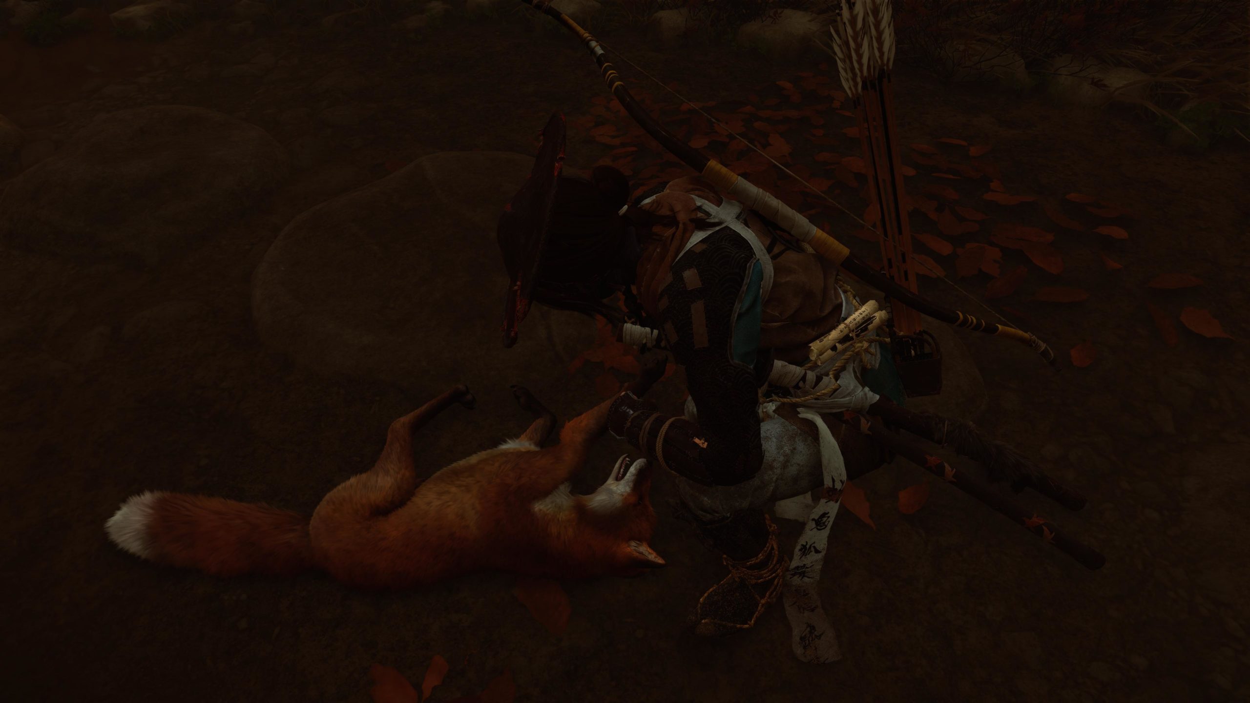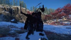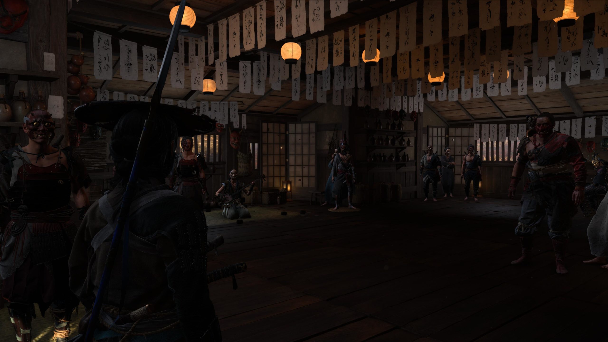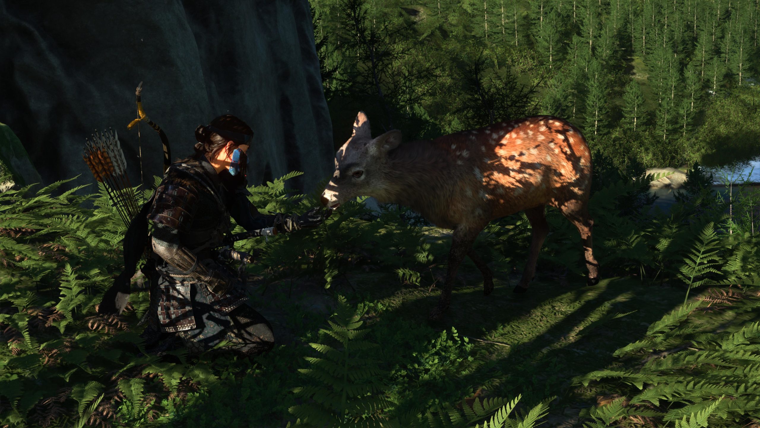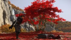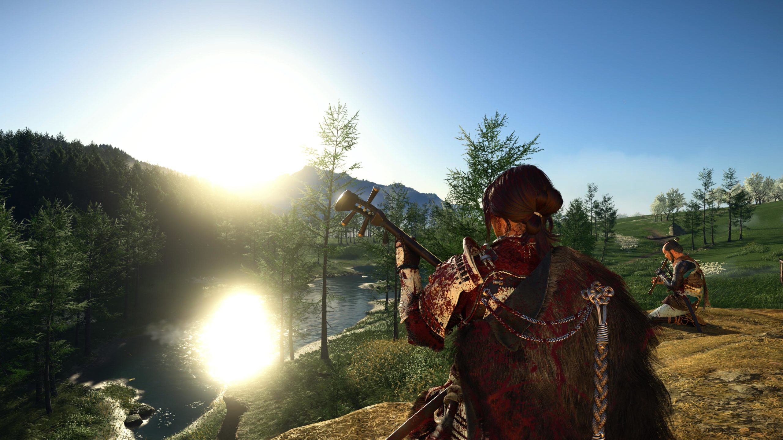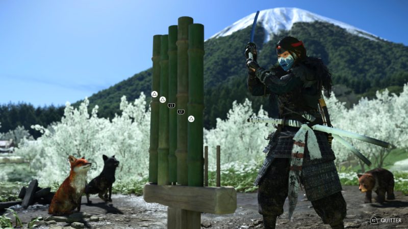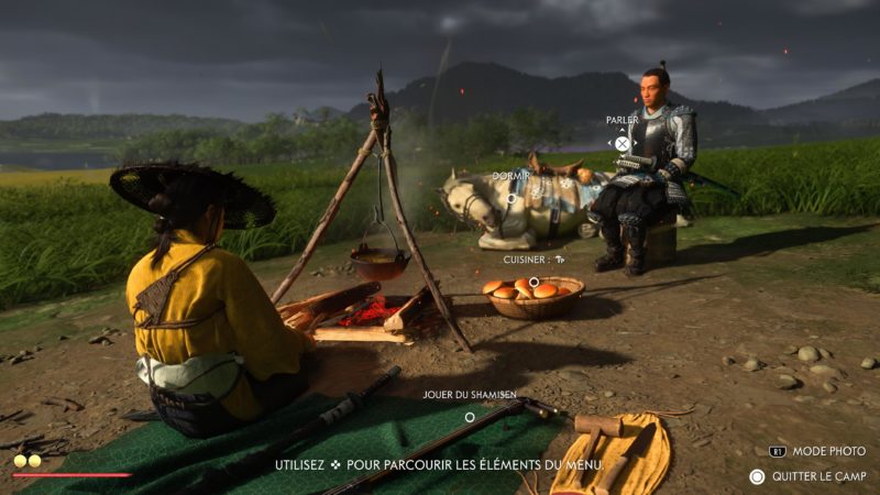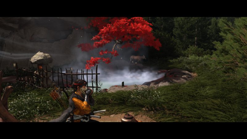 On retrouve une structure très similaire à Ghost of Tsushima. En plus des camps à vider, Atsu devra trouver les sources chaudes pour améliorer sa vie, les nombreux autels pour les capacités, les bambous pour la concentration, mais aussi les spots pour faire des peintures, les tanières des louves pour les aider contre les braconniers. Atsu peut aussi jouer du shamisen (guitare japonaise) et ainsi obtenir des avantages dans le jeu en apprenant de nouvelles mélodies. Et bien sûr les quêtes secondaires et de chasseur de prime. C’est très fourni en activités diverses et variés. Les quêtes secondaires sont plutôt bonnes et bien scénarisée. Le jeu nous mène souvent dans de nouveaux endroits bien cachés et souvent magnifiques. On ne s’ennuie pas. Il y a toujours quelque-chose à découvrir. Et le jeu a aussi quelques easter eggs bien cachés. Par contre, il n’y a plus de système de niveau et d’xp. Atsu s’améliore et se renforce avec les capacités, les améliorations d’armes et les charmes. Cela pousse à plus s’attarder sur l’exploration de la carte et trouver les points d’intérêts en fouillant ou en achetant des cartes au cartographe que de tuer des ennemis en boucle.
