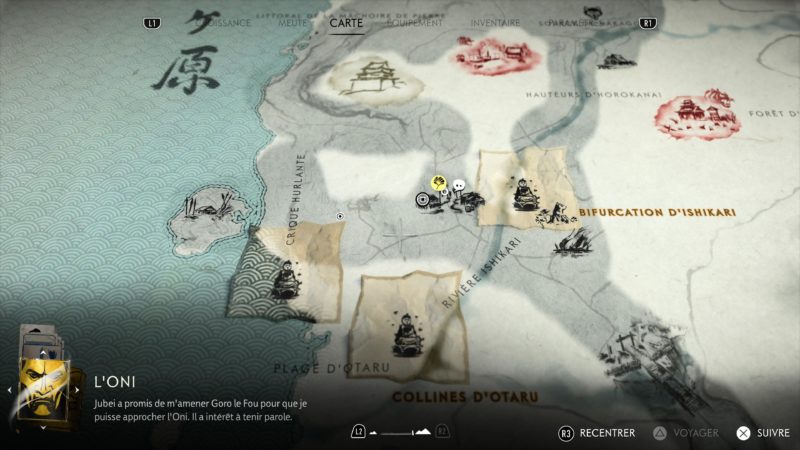 L’ATH de Ghost of Yōtei est toujours aussi propre et épuré. Le vent guide toujours la direction à prendre subtilement. L’oiseau doré est toujours là pour nous amener vers un point d’intérêt à proximité. L’ATH s’efface en exploration pour revenir lors des combats afin d’offrir une immersion totale. Les menus sont simples et pratiques à la fois. Ils indiquent lorsque des améliorations sont disponible et où les faire avec des raccourcis pour afficher les endroits sur la carte. La carte qui est d’ailleurs assez classique et pratique. Déjà, on peut se téléporter sur chaque endroit d’intérêt visiter gratuitement. Et comme il en a plein, ce n’est jamais très loin de l’endroit où l’on veut aller. Petit effort et détail sympathique des devs, la carte se mouille lorsqu’il pleut et on voit les gouttes tomber dessus. Sympa.