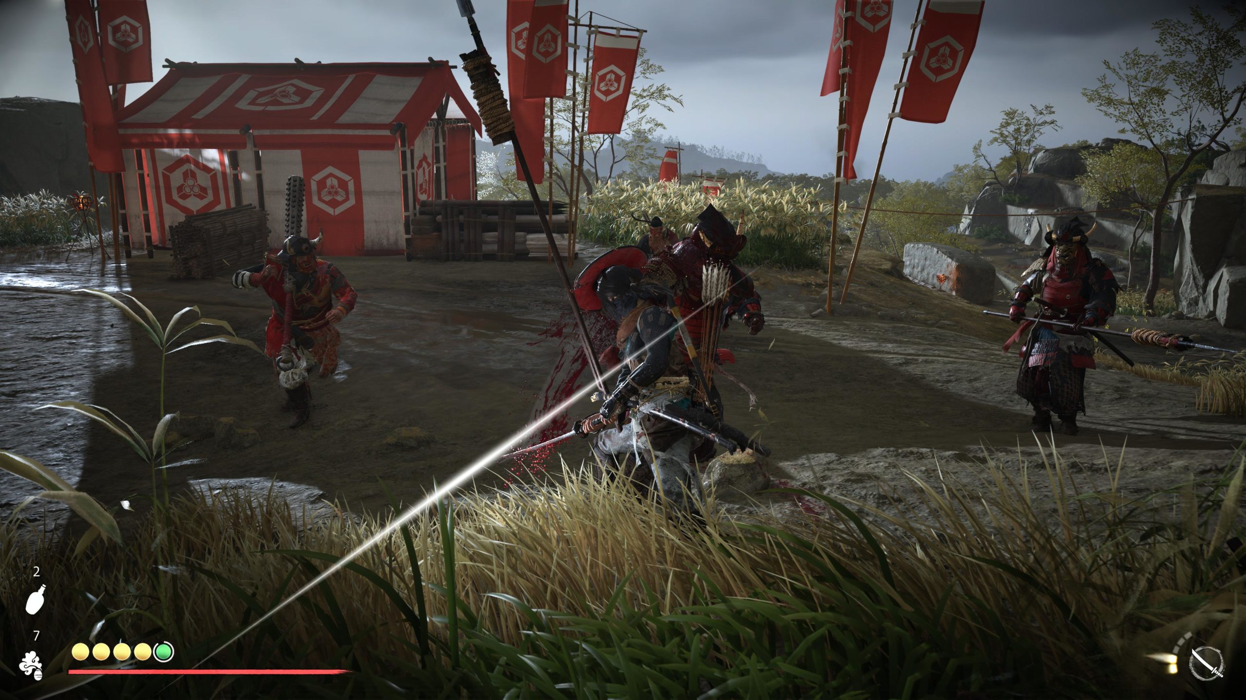 Comme dans Tsushima, le joueur peut souvent choisir entre une approche frontale en favorisant le combat brut et viscéral ou plutôt une approche plus discrète en se faufilant dans les camps en éliminant ses ennemis un après l’autre. C’est assez classique s’en réelle innovation, mais ça fait toujours le taff. Atsu peut prendre des bouteilles de sake et faire diversion. Avec le temps, Atsu gagne de nouvelles compétences de fantôme, comme utiliser ses kusarigamas pour éliminer ses adversaires à distance. Elle peut aussi éliminer plusieurs ennemis rapprochés discrètement à la chaine. La vision de ghost pour révéler les ennemis (l’écoute dans Yōtei) se gagne assez tard dans le jeu. Il faut se débrouiller sans une bonne partie de l’aventure. Atsu peut aussi voir si un ennemi à éliminer alerte un autre à proximité.