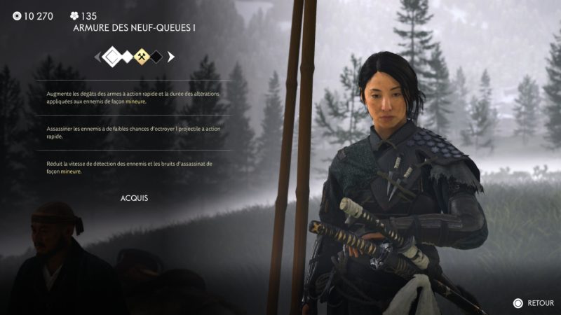 Sans être hyper sophistiqué et complexe, Ghost of Yōtei offre la possibilité de créer des builds pour Atsu. Ce n’est pas très poussé, mais avec les différents katana gagnés et récupérés tout au long de l’aventure, les armures et autres pièces d’équipement ainsi que les nombreux charmes, notre personnage peut se perfectionner de manière bien différente pour s’adapter aux différentes situations. Cinq builds peuvent être sauvés et changé rapidement. On peut faire un build furtif et létal pour s’infiltrer sans aucun soucis tel un fantôme. Ou une guerrière fatal qu’aucune lame ne résistera. Grâce aux charmes, évolutifs, Atsu gagne des capacités très utile. Il donc important de lire leurs bénéfices et monter un personnage qui correspond à vos attentes. Plus de vie, plus de concentration, moins détectable, plus d’élimination durant les confrontations, moins détectable, plus fort, plus de temps pour les contres parfaits, visée concentrée plus stable et plus longue, etc. Il y a des dizaines de charmes et d’armures pour créer l’onryo ultime. Après ça ne changera pas non plus l’expérience totalement, mais quand même un peu.