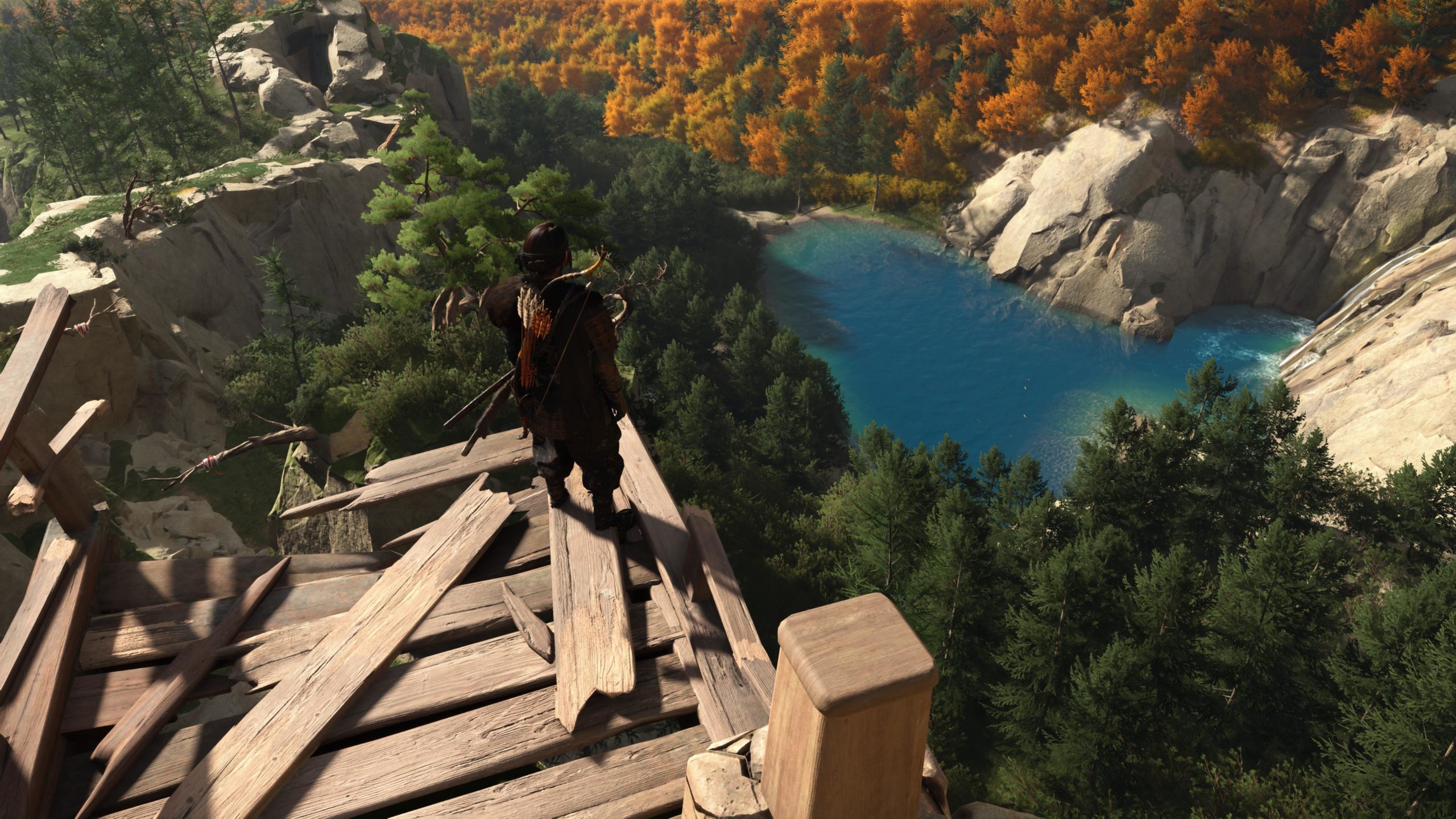 C’est toujours en monde ouvert que Ghost of Yōtei se présente. Sucker Punch studio nous propose encore une fois une bien belle grande map avec beaucoup de biomes divers et varié. Toujours très coloré avec de magnifiques panoramas, des arbres feuillus de toutes les couleurs, des fleurs, de larges plaines et des montagnes abruptes. Sans oublier le majestueux mont Yōtei qui surplombe les terres. L’exploration d’Ezo est un plaisir non-stop. Chaque région à son charme et son thème. Même si ça reste dans la même idée que Tsushima, Yōtei arrive à nous surprendre avec de petits endroits zen tellement magnifiques et poétiques. Un immense plaisir du jeu aussi c’est que la navigation est plaisante. A pied ou à cheval, Ezo se parcourt de bout en bout sans problème. Il n’y a pas de forêt dense qui bloque le passage toutes les deux minutes et qui oblige de suivre le chemin balisé. Alors tout n’est pas parfait. Il faut toujours escalader là où s’est permis et le tout reste très dirigiste, mais cela reste plaisant et satisfaisant. Les ascensions aux sanctuaires comme dans Tsushima sont très balisée, mais on y prend plaisir. Et gravir le mont Yōtei et voir le panorama de son sommet est juste à couper le souffle.