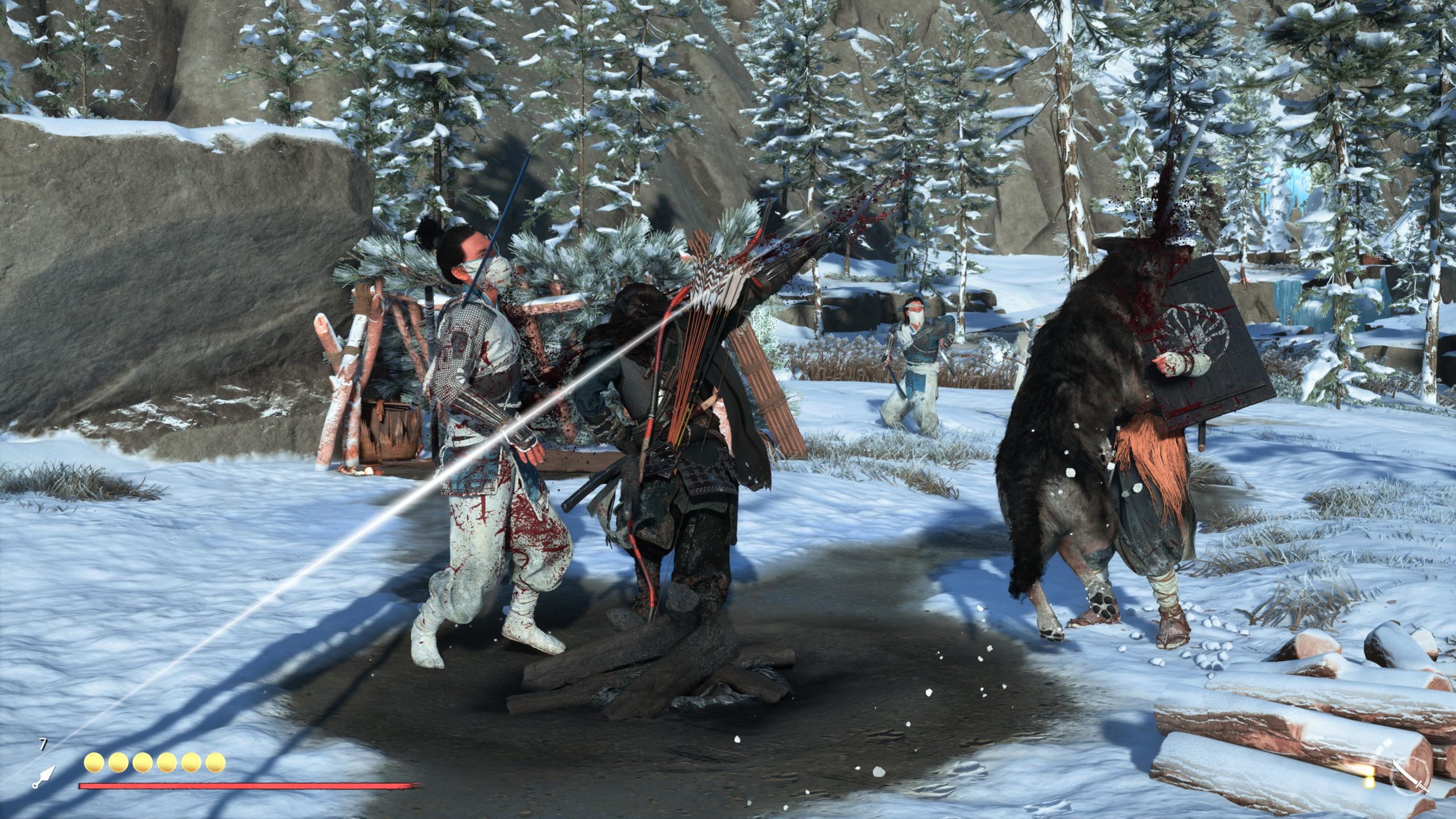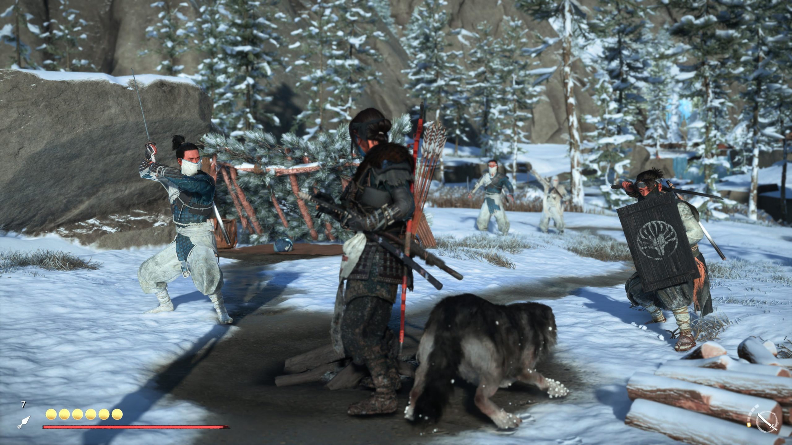 Ghost of Yōtei a toujours les moments de confrontation qui permettent de liquider un ou plusieurs opposant en un seul coup. Basé sur les réflexes, Atsu peut éliminer 1, 2 voire 3 adversaires. La louve vient parfois aider Atsu pour éliminer un ennemi supplémentaire et aider dans le combat. Et on peut aussi ajouter un coup de fusil pour finir. Atsu peut pratiquement décimer un convoi entier en une seule confrontation réussie.