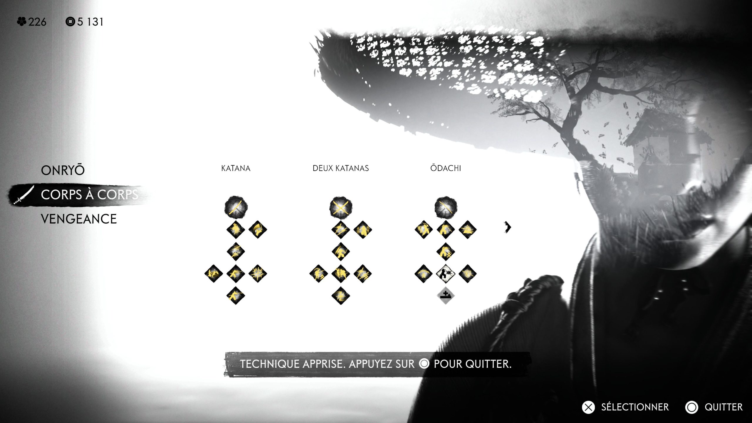 Le combat est toujours aussi percutant, brutal et jouissif avec son système de contre. Il est toujours aussi plaisant de trancher et couper des membres au katana. Mais le système de combat évolue avec la grande nouveauté le double katana qui apporte dynamisme et fureur. Au lieu de changer de posture dépendamment de l’adversaire, il faut cette fois changer d’arme. Et le changement se fait à la volé. Il est important de sélectionner la bonne arme pour attaquer mais surtout pour briser les gardes. Le katana est fort contre d’autres katana, mais contre les faucilles ou les hasts, mieux vaut choisir une autre arme. Il y a donc le katana, le double katana, mais aussi l’odachi, un long sabre parfait contre les grosses brutes, le kusarigama avec sa chaine qui brise les boucliers et le hast, un long pique qui tient les ennemis à distance. Toutes ses armes évoluent, que ce soit en puissance, mais aussi avec de nouvelles attaques que l’on obtient avec des points de capacité gagnés avec les autels de méditation. Manette en main, les bases du système de combat est très simple. Carré pour les coups moyen, triangle pour les coups lourds et briser la garde et finalement L1 pour contrer et rond pour l’esquive. Classique et efficace. Il est possible de changer carré et triangle pour R1 et R2. Mais ensuite, le jeu offre plus d’options de combat qui viennent se greffer avec les actions rapides sur R1 pour lancer des kunais ou tirer au pistolet. L’arc, le mousquet et les bombes sur L2. Et les attaques de concentration. Donc dire que le système de combat se réduit à marteler carré et triangle n’est pas tout à fait honnête. Il est assez simple, mais propose pas mal d’options pour perfectionner son art.