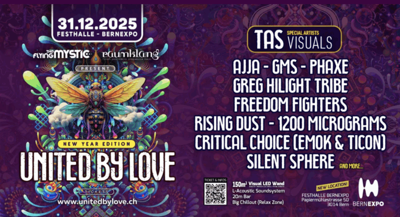 Le 31 décembre, cap sur le Festhalle Bernexpo pour la soirée de Nouvel An « United by Love », signée The Flying Mystic. Avec des pointures telles que le maître Ajja, 1200 Micrograms, l’incontournable Rising Dust ou encore Phaxe, de retour derrière les platines après le PsyRiver, cette nuit s’annonce comme l’un des événements trance majeurs de l’année en Suisse. Une façon idéale de célébrer le passage à 2026 !