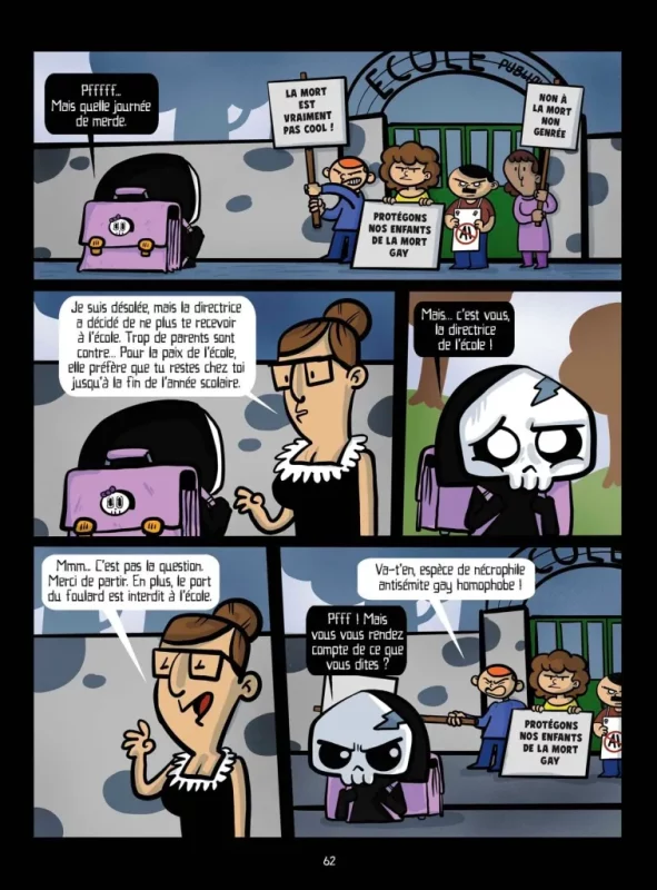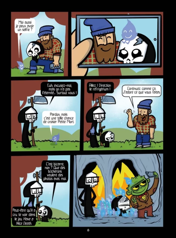 Principalement créée dans le but d’ouvrir l’esprit des bédéphiles sur la bêtise de notre monde, cette bande-dessinée de 96 pages n’y va pas par quatre chemins. Ce tome (qui alterne entre le récit de La Petite Mort et des extraits du magazine Petite Mort Kid) peut se lire indépendamment des autres albums.